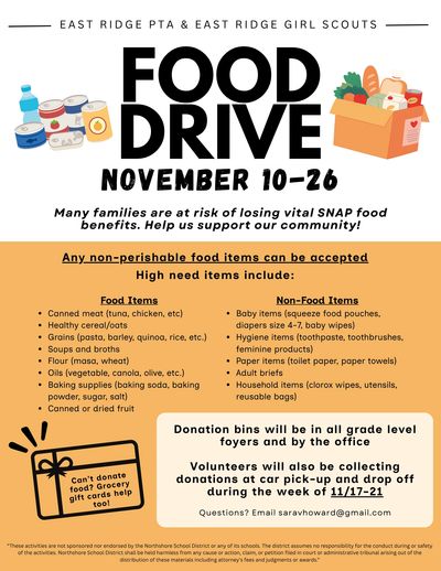 Many local families rely on vital SNAP food benefits, and your support can make a difference. From November 10–26, the East Ridge PTA and Girl Scouts are collecting non-perishable food and essential household items for our community.