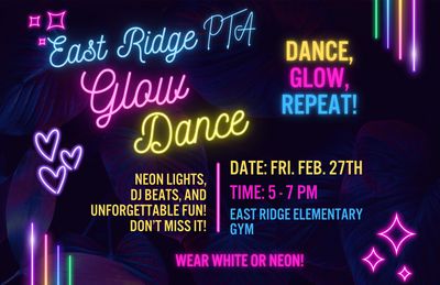 Join us on Friday, February 27 from 5–7 PM in the East Ridge Gym for an evening of music, dancing, and glowing fun. Enjoy a live DJ, glow sticks, and glow face paint as we move, groove, and celebrate together. Wear your brightest or neon colors and come ready to shine, we can’t wait to see you there!