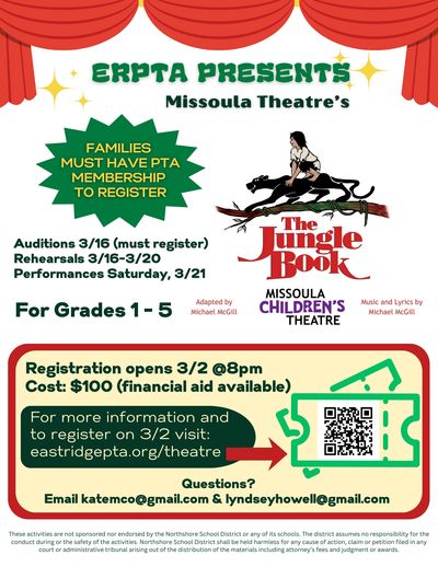 Join us for an exciting week of theater! Missoula Children’s Theatre is bringing The Jungle Book to East Ridge Elementary, and your student can register to be part of the show.