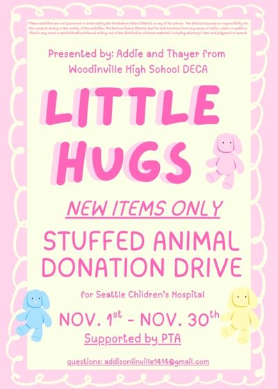“Did you know that over 500,000 children experience debilitating illnesses each year, having to spend days to months in hospitals? No child should have to suffer, and while we can't take away their pain, we can try to add some joy to their experience in the hospital. That is why Woodinville DECA is partnering with YOUR school to gather new and unused stuffed animals to donate to Seattle Children's Hospital at the beginning of December. This drive runs all of November, so be sure to stop by the donation box in your school to give back today!” - Addison & Thayer
